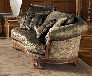 Большой двухместный диван в классическом стиле покорит Вас плавностью линий и изумительным дизайном. Подлокотники выполнены в форме мягких валиков, которые загибаются заружу. Массивные и устойчивые ножки имеют форму пирамиды и украшены большими цветами. По всему периметру проходит резьба, выполненная вручную лучшими мастерами Италии. Сверху нанесено покрытие из сусального золота, оформленного по старину. Ткани и декор можно выборать индивидуально.