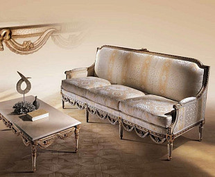 Великолепный трехместный диван в классическом стиле создан на знаменитой итальянской фабрике элитной мебели. Идеальное сочетание из дерева ценных пород и ручной резьбы создают поистине королевский вид. Каждая ножка конусообразной формы украшена роскошным цветком. По всему фасаду проходит резная переплетенная лента, мягко ниспадающая вниз. Обивка из дорогих тканей класса "люкс" благородных приглушенных тонов. Материалы и декор могут быть подобраны индивидуально.