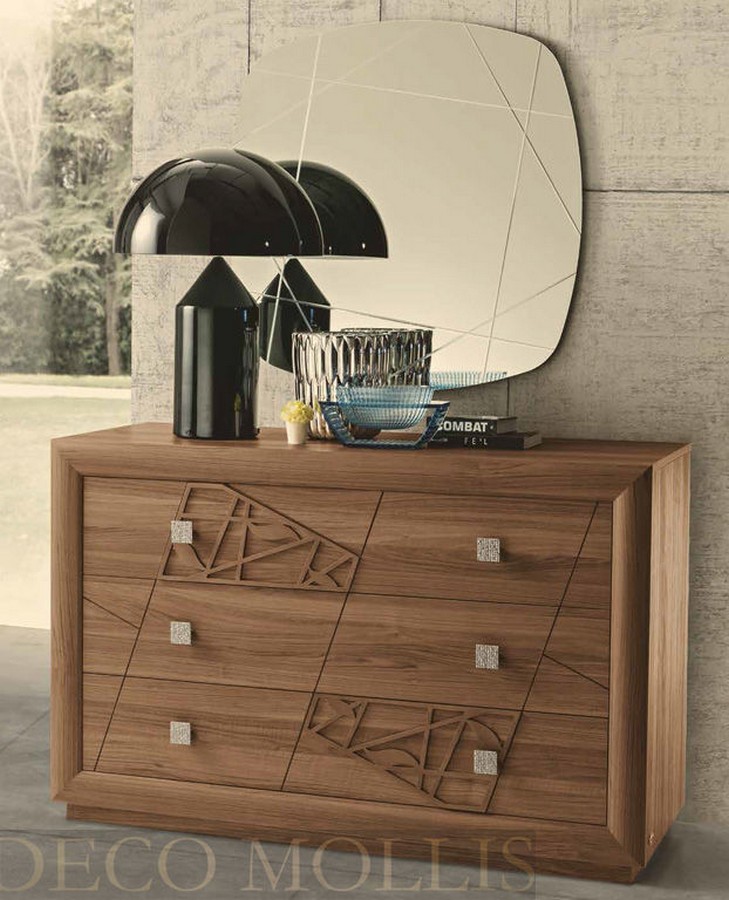 Итальянский комод Chantal Структура выполнена из частиц дерева толщиной 18 мм и покрыта внешне ламинатом цвета ореха с открытыми порами и матовой отделкой, а передние панели ящиков - это панели из древесных частиц высокой плотности толщиной 22 мм, покрытые все тем же ламинатом цвета ореха. Ящики, кроме передних панелей, состоят ещё из боковых окрашенных панелей, сделанных из березовой фанеры, толщиной 15 мм, и дна из древесных частиц толщиной 4 мм, покрытых ламинатом цвета ореха, скользящего по доводчикам из металла, оснащенных амортизированным входом. Под дном вставлен укрепитель для обеспечения выдвижения самого ящика.