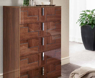 Итальянский комод высокий Memphis сэкономит пространство, при этом имеет 5 вместительных выдвижных ящикjd для хранения белья. Отделка шпоном дерева Кото и глянцевые фасады с оригинальным узором. Цветовое исполнение "Грецкий орех" добавит уюта и гармонии Италии в спальню.