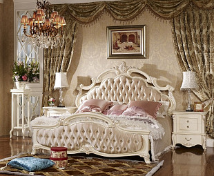 Мебель выполнена из МДФ в белоснежно-жемчужном оттенке с глянцевыми фасадами. Изголовье резное, мягкое, обито атласной тканью, дополнительно декорирована объемными элементами из пенополиуретана с золочением, ножки декоративные, изогнутые.