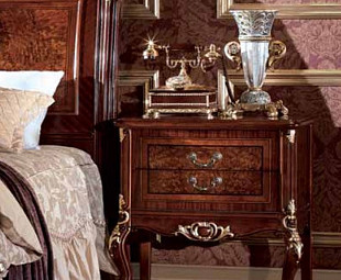 Тумба из коллекции Сarpenter 223 классическая прикроватная с двумя выдвижными ящиками, отлично дополняет интерьер спальни. Изделие выполнено на изогнутых ножах из массива дерева в отделке цвета орех, с добавлением элементов ручной резьбы.
