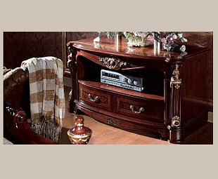 Аккуратная тумба под ТВ из коллекции китайского бренда выполнена в классическом стиле, имеет два выдвижных ящика и открытую полку. Благодаря небольшим размерам может дополнить интерьер не только гостиной, но и спальни. Предмет изготовлен из массива дерева в отделке шпоном, с добавлением резных элементов декора.