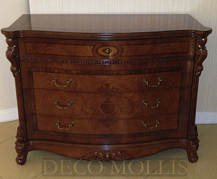 Комод бельевой из коллекции Angelina. Комод из имеет четыри выдвижных ящика с металлическими резными ручками, украшен комод ручной лепкой и красивыми узорами. Комод сделан из массива березы, в отделке из натурального шпона корня оливы.