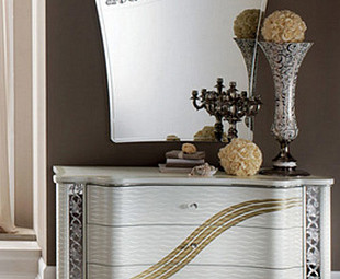 Классический комод Miro концерна Arredo Classic изготовлен из высококачественного МДФ и ДСП. Этот функциональный и практичный предмет обстановки примечателен интересной формой конструкции и оригинальным дизайном: красивый отблеск белого перламутра, нестандартная поверхность столешницы, выгнутый фасад, шарообразные ножки, серебристые декоративные вставки по бокам, прозрачная окантовка верхнего края, узор в виде волнистых линий и еще много приятных нюансов, раскрывающихся при ближайшем рассмотрении.