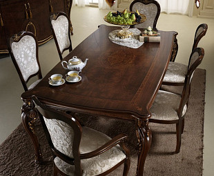 Классический обеденный стол Donatello являет собой яркий пример респектабельной классики в лучших традициях итальянского мебельного производителя Arredo Classic. Красиво изогнутые фигурные ножки богато декорированы резными элементами ручной работы, покрытыми сусальной позолотой. Столешница украшена красивым рисунком, подчеркивающим достоинства дерева. Дополнительно комплектуется мягкими стульями.