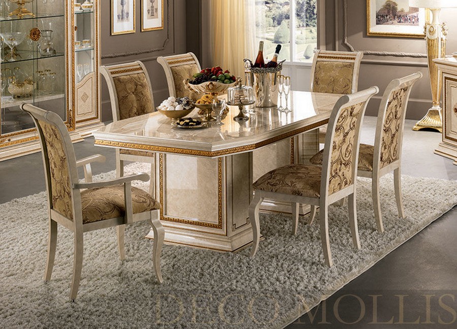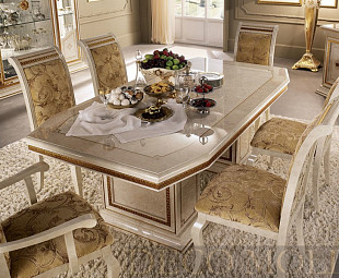 Классический обеденный стол Leonardo изготовлен из качественного МДФ и представлен в бежевом с золотым оттенках. Основанием служат две массивные ножки-опоры, а столешница выполнена в виде многогранника. Красивый декор с эффектом позолоты в виде резных накладок повторяет внешние контуры.