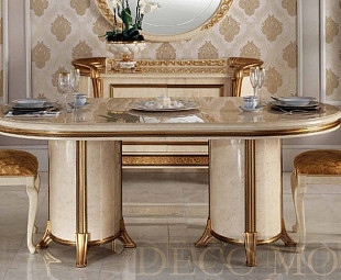 Классический обеденный стол Melodia фабрики Arredo Classic. Стол выполнен в классическом стиле лучшими итальянскими мастерами и дизайнерами. Стол сделан из высококачественного МДФ в цвете слоновая кость с золотом. Стол не раскладной.