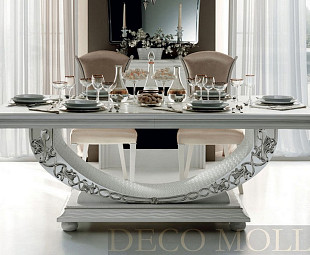 Классический стол Miro итальянского производителя Arredo Classic примечателен своим необычным дизайном. Монументальная, основательная столешница опирается на оригинальную опору в виде полукруга, украшенного серебристым узором. Основанием служит устойчивая подставка ступенчатой формы на шарообразных ножках. Дополнительно комплектуется мягкими стульями.