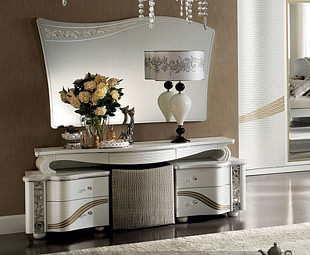 Классический туалетный столик Miro выполнен в лучших традициях итальянского качества из технологичного современного материала – плит МДФ и ДСП, обладающих гибкостью при изготовлении и практичностью в эксплуатации. Модель представлена в цвете перламутровый белый и отличается богатым декорированием: серебристые вставки, красивые ручки, блестящая окантовка, волнообразный узор на фасадной поверхности. Эргономичная форма позволяет рационально использовать каждый сантиметр пространства: в нишу между двумя вертикальными рядами ящиков органично вписывается пуф из этой же коллекции, образуя единую конструкцию. Ящики, горизонтально расположенные под столешницей, служат вместительным хранилищем нужных мелочей. Большое настенное зеркало станет незаменимым участником ансамбля.