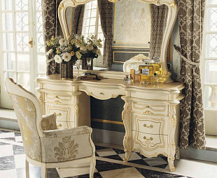 Классический туалетный столик Opera. Роскошный туалетный столик Opera сделан итальянскими мастерами и дизайнерами в классическом стиле, и выполнен в нежном цвете слоновой кости с добавлением позолоченной фольги, что придает помещению дополнительное визуальное пространство. Классический туалетный столик для спальни сделан из высококачественного массива и дополнен шпоном. Стильный и элегантный классический туалетный столик дополнит любой самый изысканный интерьер вашего дома.