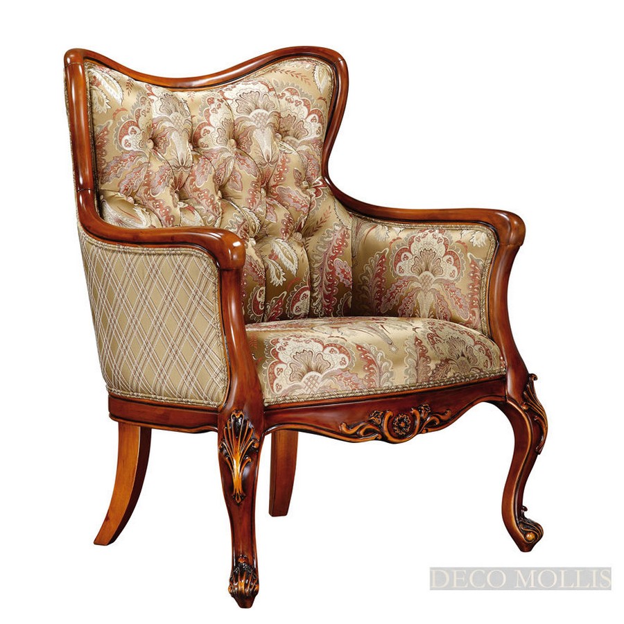 Кресло коллекции Carpenter 236. Элегантное кресло для гостиной сделано из массива дерева в отделке цвета орех, с добавлением ручной лепки и декоративной резьбы. Обивка выполнена из текстиля высокого качества.