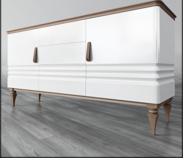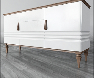 Комод белый глянец Torino Taranko выпускается польской фабрикой в классическом стиле. Для производства фасадных частей и корпуса берутся высококачественные ДСП и МДФ, покрытые шпоном. Столешница и ножки производятся из массива дуба. Производителем предлагается модель в двух вариантах: