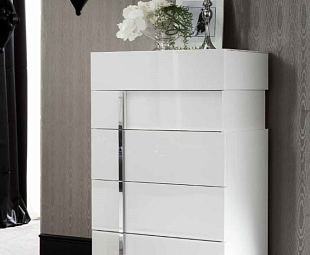 Комод белый в спальню высокий Canova с пятью ящиками позволит хранить все необходимые вещи в должном порядке. Элегантное оформление в белом глянце с декором из Каррарского мрамора. Изящное и невесомое дополнение в спальном гарнитуре.