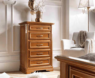Комод для белья Marco Polo с пятью выдвижными ящиками поможет гармонично распределить вещи для хранения. Классический цвет "Орех" задекорирован роскошным узором сусальным золотом. Стильный и утонченный предмет интерьера для спальни.