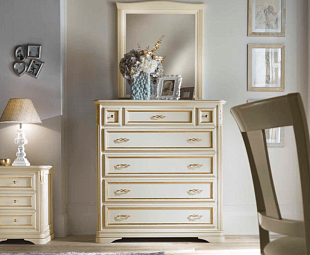 Комод для белья с ящиками Marco Polo с пятью выдвижными отделениями для хранения позволит гармонично распределить все необходимое. Фасады сливочного оттенка украшены декоративной резьбой с сусальным золотом. Изящные ручки и классический дизайн делают данный предмет интерьера роскошным и стильным.