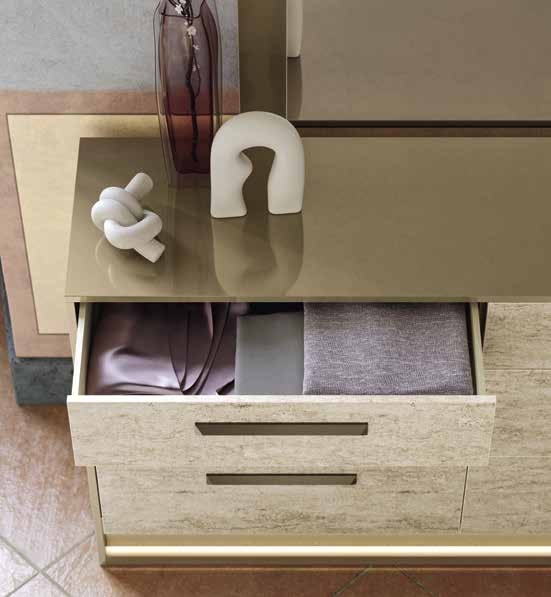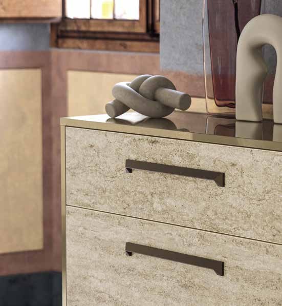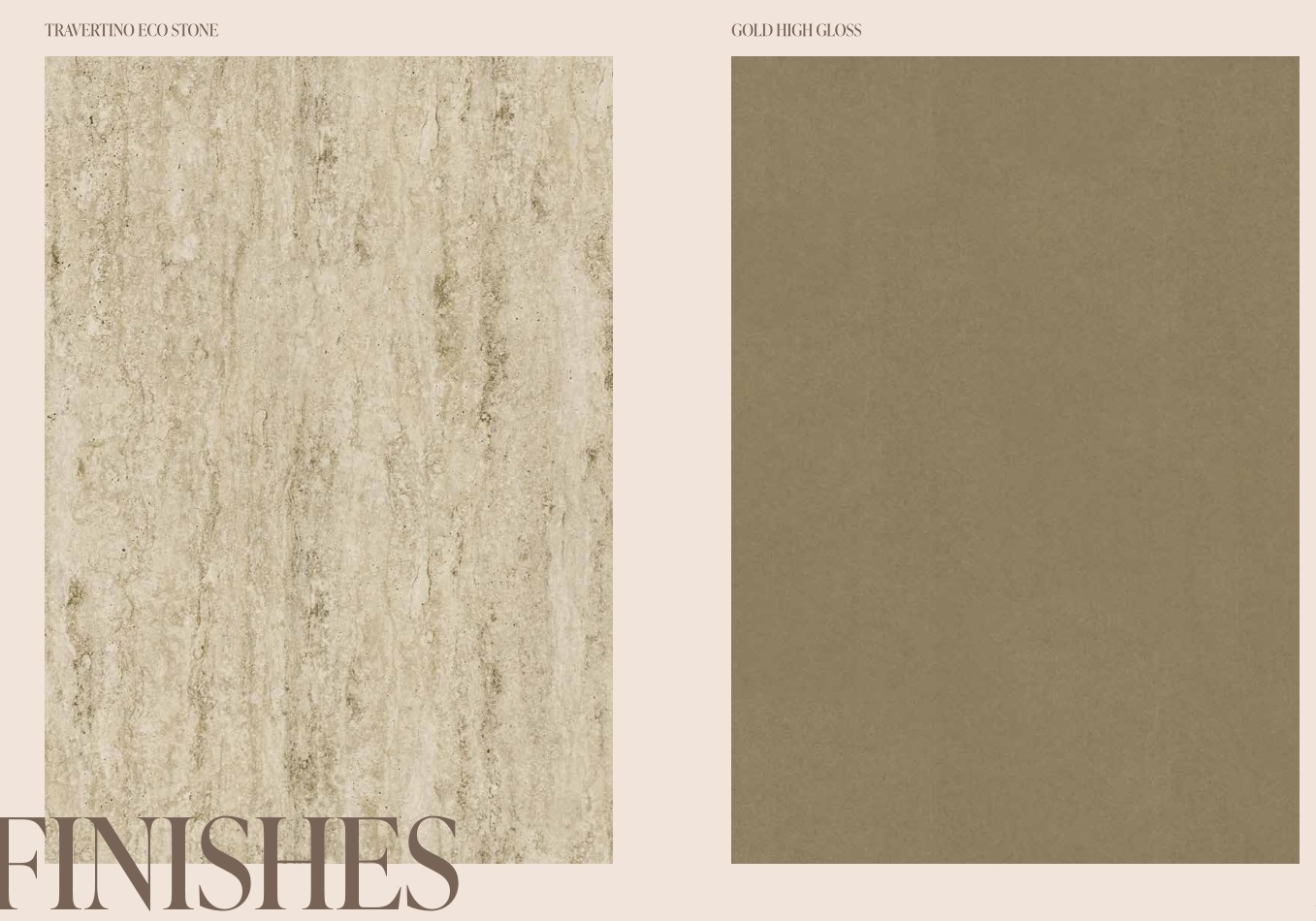 Красивый фасад с покрытием под травертин, с боковинами и столешницей в глянце с вкраплением золота.