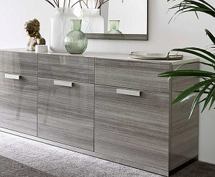 Широкий комод для посуды Iris – важнейший элемент при обустройстве обеденной зоны гостиной. Внутреннее пространство изделия с большим количеством полок и ящиков ориентировано на максимально комфортное размещение в нем столовых приборов. Минималистичный дизайн избавляет от ощущения тяжести, а отделка в технике «высокого глянца» придает буфету богатый, несколько ампирный вид.