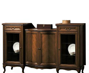 Компактная и удобная мебель для хранения посуды и декорирования комнаты. Два боковых отдела, закрытые стеклянными дверями, делают возможным добавление интересных цветовых акцентов в дизайн интерьера.