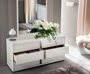 Комод для спальни белый Imperia прекрасно гармонирует с предметами интерьера в современном стиле. Три больших удобных выдвижных ящика для хранения, отделка шпоном дерева Koto с глянцевыми фасадами и хромированными вставками. Изящество и грация Италии.