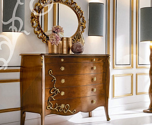 Комод с пятью выдвижными ящиками в стиле классика, коллекции Charme. С резьбой и рельефным узором идеально впишется в вашу спальню. А золотые ручки завершат утонченный внешний вид.