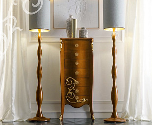 Комод для спальни в классическом стиле от коллекции Charme. Корпус комода выполнен из массива. Он состоит из семи выдвижных ящиков с красивым деревянным фасадом в цвете орех и ручками с золотой отделкой.