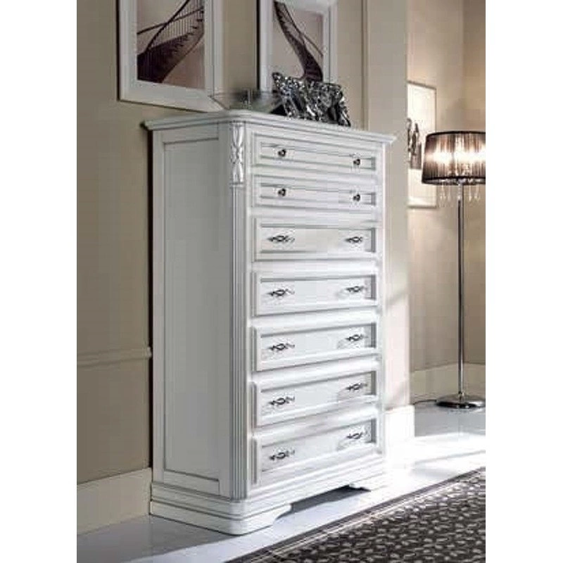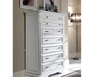 Комод в традиционном стиле установлен на невысоких ножках и оборудован семью вместительными ящиками с украшенными передними панелями. Изделие декорировано искусной резьбой.