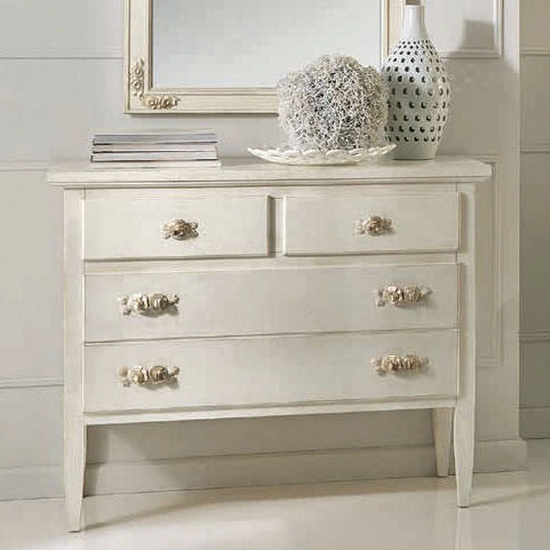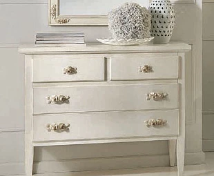 Комод с высокими ножками выполнен в традиционном стиле. Он оснащён четырьмя ящиками разных размеров, которые легко выдвигаются. Оригинальные фигурные ручки добавляют особый шарм этой модели.