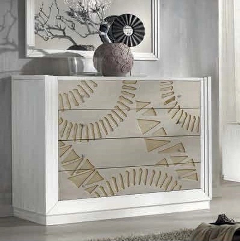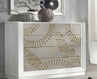Этот комод выполнен в неоклассическом стиле. Он оснащен четырьмя выдвижными ящиками. Фасады украшены изысканным орнаментом.