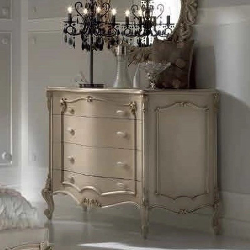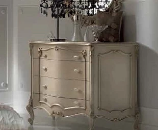 Комод с изогнутыми ножками выполнен в традиционном стиле. Он украшен изящной резьбой и оборудован четырьмя выдвижными ящиками.