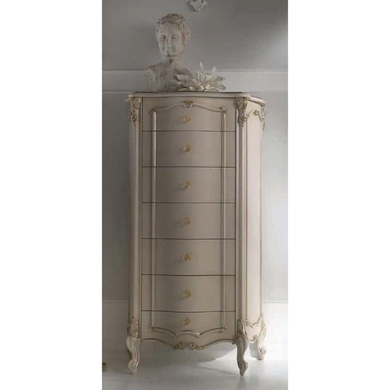 Комод с изогнутыми ножками выполнен в традиционном стиле. Он украшен изящной резьбой и оборудован семью выдвижными ящиками.