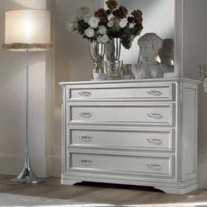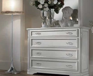 Комод с низкими ножками выполнен в традиционном стиле. Он оснащен четырьмя выдвижными ящиками с декоративными фасадами.