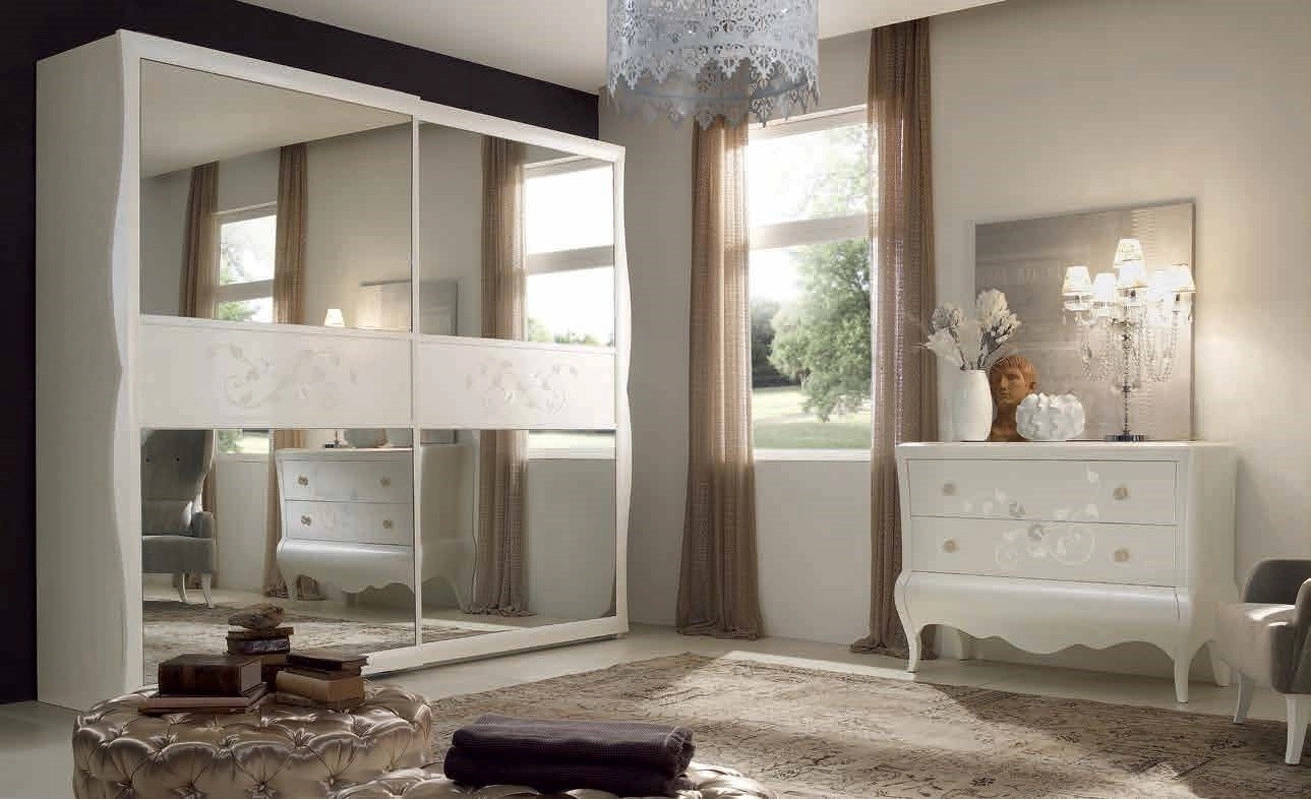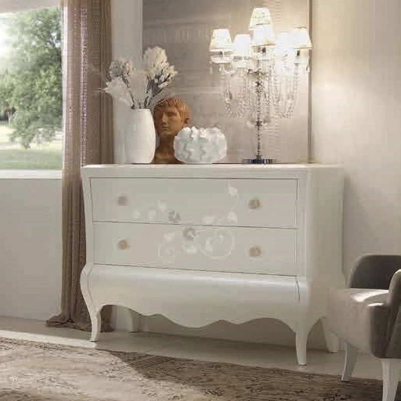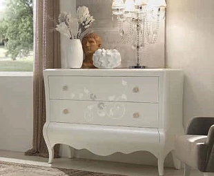 Этот комод с изогнутыми ножками выполнен в неоклассическом стиле. Он оснащен двумя выдвижными ящиками. Фасады украшены изысканным растительным узором.