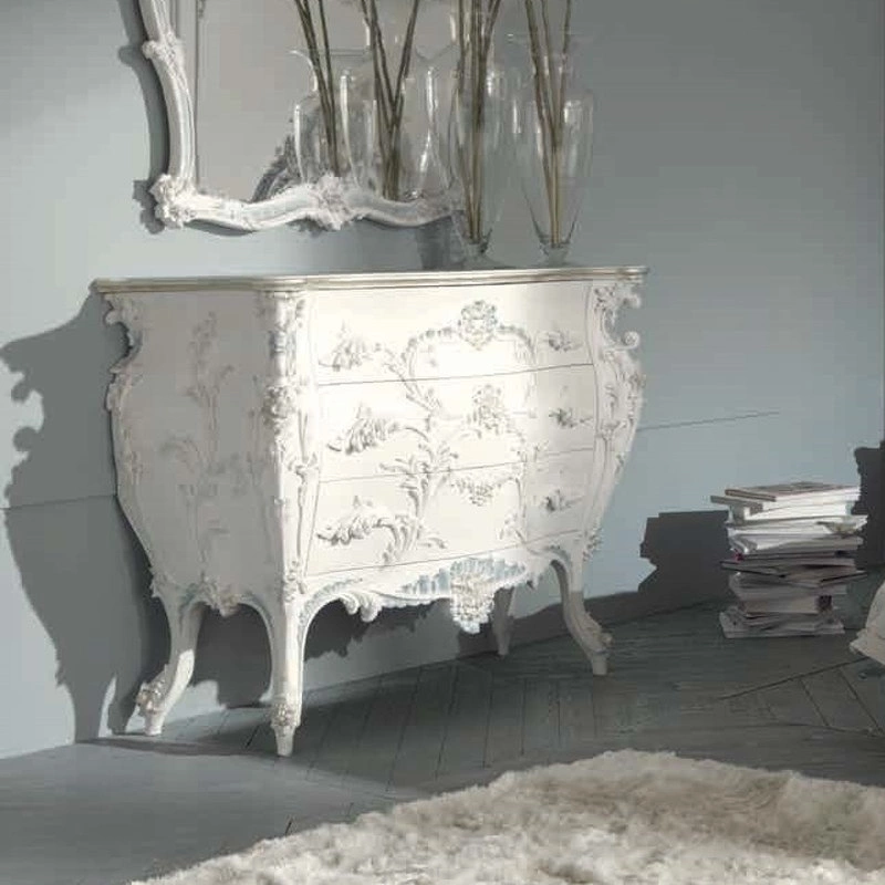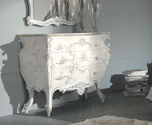 Комод с изогнутыми ножками выполнен в традиционном стиле. Он украшен изящной резьбой и оборудован тремя выдвижными ящиками.