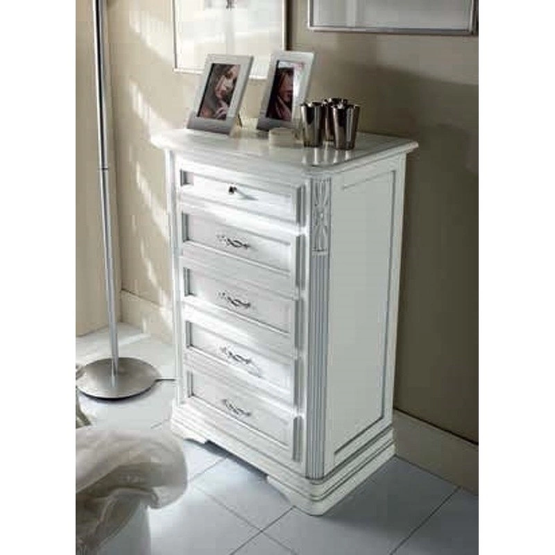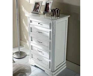 Комод с низкими ножками выполнен в традиционном стиле. Он оснащен пятью выдвижными ящиками с декоративными фасадами. Украшен изящной резьбой.