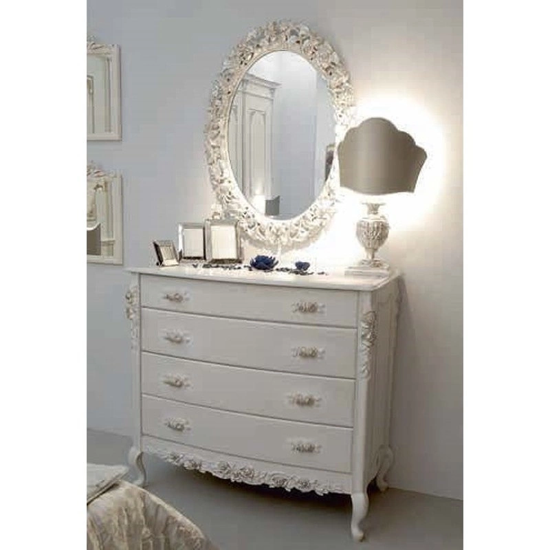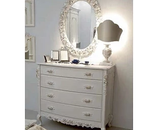 Комод с изогнутыми ножками выполнен в традиционном стиле. Он украшен изящной резьбой и оборудован четырьмя выдвижными ящиками.