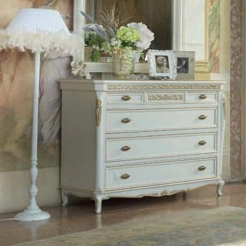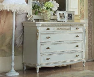 Комод с изогнутыми ножками выполнен в традиционном стиле. Он украшен изящной резьбой и оборудован пятью выдвижными ящиками.
