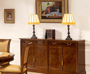 Шпон американского ореха или оливы с инкрустацией из корня вяза, патина золото или серебро, лак.