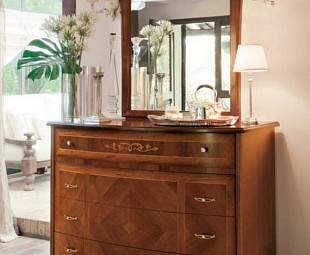 Комод с четырьмя выдвижными ящиками Lady фабрики Alf оформлен лучшими итальянскими мастерами в классическом стиле с отсылками к бидермейер. Предмет сделан из высококачественного массива дерева и шпона ореха, благодаря чему фасад изделия представлен строгой, но красивой древесной текстурой.