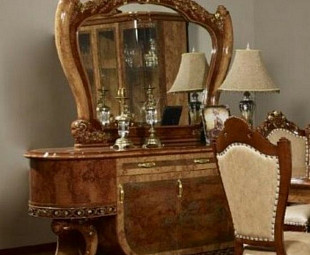 Выполнен в гармоничном цвете "Орех" из МДФ. По краям расположены тумбы на изогнутой декоративной ножке, составляющие общую композицию. Посередине находятся ниши, скрытые за дверями, а также имеется выдвижной ящик. Фасады украшены росписью с позолотой.