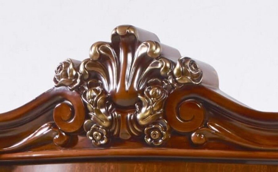 Сверху расположено зеркало в роскошной рельефной раме, имеет три отделения с распашными дверями и пять выдвижных ящиков для мелких принадлежностей.