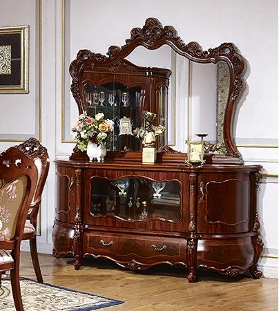 Имеет три отделения с распашными дверцами, посередине стеклянными и выдвижной отсек снизу. Сверху располагается большой зеркало в резной раме.