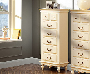 Комод с ящиками Прованс создан лучшими итальянскими мастерами и дизайнерами. Комод удачно сочетает в себе французский шарм и итальянскую респектабельность. Цвет слоновой кости с оттенками жемчужного и нанесенный мастерами вручную рисунок, выполненный по мотивам старинной гравюры, делает комод похожий на письмо из прошлых столетий. Комод представлен в трех вариантах, цвете слоновая кость с добавлением лепки, в цвете слоновая кость с добавлением золота и в цвете слоновая кость с добавлением росписи. Комод выполнен из высококачественного массива. Элегантный комод, выполнен в классическом стиле прошлых веков, комод наполнит интерьер вашего дома комфортом, теплом и уютом.