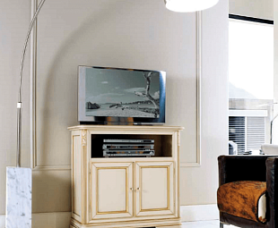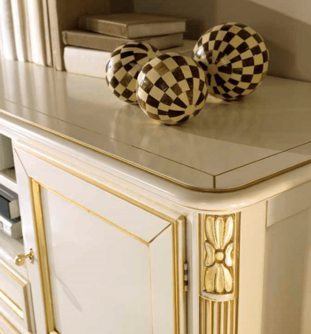 Комод в гостиную элитный Marco Polo гармонично впишется в классический интерьер. Роскошный и вместительный, имеет два отделения с распашными дверцами, две открытые ниши и выдвижной ящик. Фасад украшен резным орнаментом с отделкой сусальным золотом.