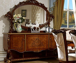 Имеет четыре распашных дверцы с полками внутри, снизу расположены открытые ниши, а сверху большое зеркало в роскошной декоративной резной раме с позолотой. Изготовлен из МДФ в цвете "Орех". Фасады имитируют структуру дерева и покрыты ручной росписью.