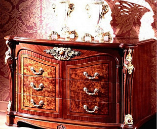 Комод в спальню из массива Сarpenter 223 изготовлен из массива дерева отделан шпоном в цвете орех. Декорирован резьбой с позолотой в легкой патине. Имеет шесть выдвижных ящмка - по три с каждой стороны. Поможет содержать белье в идеальном порядке. Красив и удобен