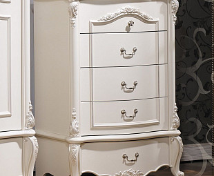 Грациозный, исполнен из МДФ белоснежного оттенка, фасады глянцевые, украшены объемными элементами из ППУ с цветочными орнаментами. Имеет пять выдвижных ящиков для удобства хранения белья.