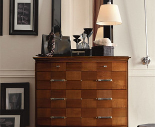 Классический комод в цвете вишня из коллекции Riva Villanova изготовлен из древесины ценной породы – черешни. Гладкая, плотная структура дерева выгодно оттеняется геометрическим рисунком. Четыре вместительных ящика украшены никелированными матовыми ручками. Фасад отличается эффектом под старину, особо прослеживающимся на стыках, кромках и гранях. Особого внимания заслуживают интересные резные ножки.