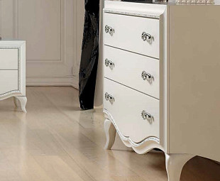 Изысканный комод для одежды Saint Tropez воплощен в соответствии с канонами неоклассического стиля - позаимствованные у античности гнутые ножки и фигурный фасад, и в то же время аскетичная сдержанность в убранстве. Модель выполнена из цельного дерева и многослойной древесины, в отделке шпоном белого цвета. Имеются три вместительных ящика, фасады которых по периметру украшены миниатюрными кристаллами swarovsky.