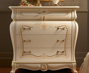 Комод в спальню светлый Ducale красивой формы классический, декорирован резьбой с золотом, патинированный. имеет три широких выдвижных ящика для белья. В верхней части - откидной столик, открывающий пространство с маленькими ящичками и нишами для хранения украшений и милых вещичек. Красив и уютен